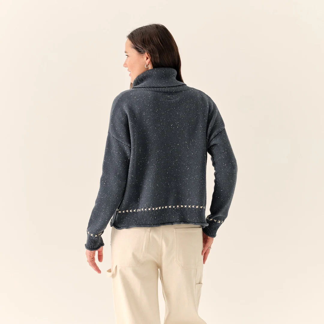 A hearty, heritage-inspired coastal knit made with SeaWool - crushed oyster shells are woven with recycled PET (plastic bottles) plastic to make a fabric that is warm and structured just like regular wool. Finished with embroidery stitch details, foldover cowl neck and rib trim. Warm, soft, and timeless.
